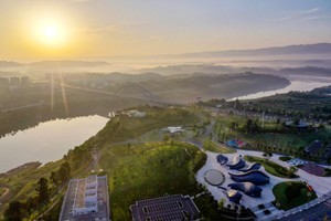 圖為2023年7月23日,晨曦和薄霧把四川省廣安市渠江紅灘音樂公園映襯得格外美麗祥和。 (邱海鷹)