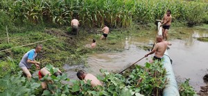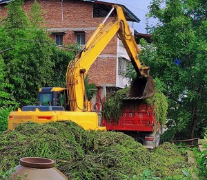 次日一大早,村黨委負(fù)責(zé)人在現(xiàn)場觀察發(fā)現(xiàn),河道水位太深,打撈難度非常大。大家集思廣益,先是計劃用挖機(jī)打撈,但沒有道路能讓挖機(jī)駛?cè)牒哟哺浇S后又計劃用吊車在金鑫石業(yè)場地里遠(yuǎn)吊,可距離太遠(yuǎn),也無法實施。最后,村黨委商量決定再次發(fā)動年輕黨員、隊長,繼續(xù)用人工的方式進(jìn)行河床水草清運(yùn)。