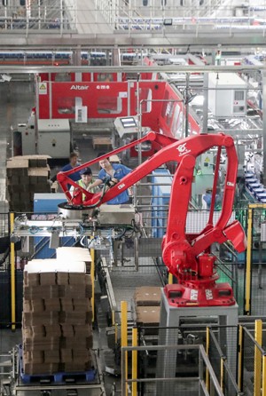 2023年7月13日,華潤雪花啤酒(四川)有限責(zé)任公司廣安分公司的員工在利用智能機器轉(zhuǎn)運啤酒包裝箱板。