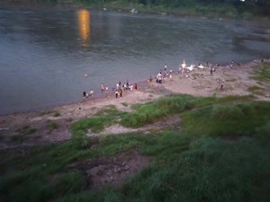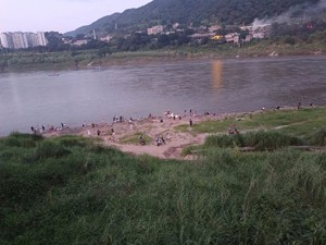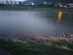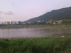 夜暮中的重慶北碚正碼頭公園落霞迷人,江水映日格外出彩。