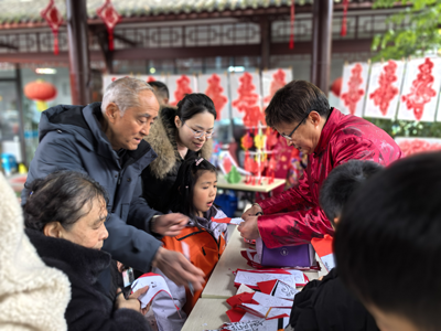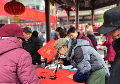 無聯(lián)不成春,有聯(lián)春更濃。在一片歡樂祥和的氛圍中,書法老師揮毫潑墨,將美好的新春祝福一筆一畫寫進(jìn)春聯(lián)里,一副副充滿寓意吉祥的春聯(lián)、一張張喜氣洋洋的“?!弊周S然紙上,“民富國(guó)強(qiáng)四海春,人和政善萬家?!薄翱萍寂d國(guó)展宏圖,科普為民神州歡”“事事如意大吉祥,家家順心永安康”,紅紙黑字,筆墨暈染,既有對(duì)偉大祖國(guó)繁榮昌盛的贊美,也有對(duì)辭舊迎新的美好祝愿,為即將來臨的蛇年春節(jié)增添了濃濃的節(jié)日氛圍。居民們手捧春聯(lián)和“?!弊郑樕涎笠缰矐c的笑容,紛紛表示老師現(xiàn)場(chǎng)書寫的春聯(lián)就是不一樣,看著紅紙上的一筆一劃、聞著墨香,年的味道就出來了。