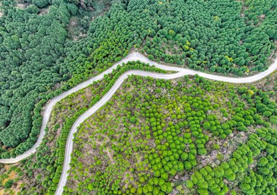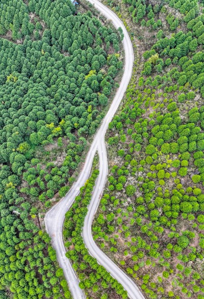2025年3月11日,鳥瞰四川省華鎣市利用華龍街道柏木山的石漠化土地和荒山荒坡成片發(fā)展起來的油樟產(chǎn)業(yè)基地一角。
