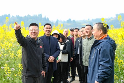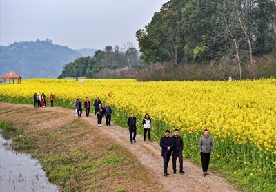 華鎣市文史研究員首先來到武勝縣沿口鎮(zhèn)江家壩子,參觀利用嘉陵江的灘涂種植的彩色油菜花田。色彩斑斕的花田像一條彩帶,與碧綠的嘉陵江水相互映襯,構成黃綠相間的美麗畫卷。漫步花海,微風拂過,花浪翻涌,使人心曠神怡。讓研究員眼前一亮的是:游客不僅可在油菜花海感受爛漫春光,也可參與戶外燒烤、江畔野炊、沙灘摩托和戶外研學等多種活動,盡情享受鄉(xiāng)村旅游的獨特魅力。