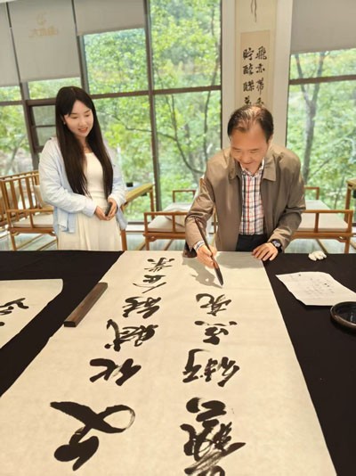 掛牌儀式結(jié)束后,南充、營山的書法家們即興揮毫、筆走龍蛇,為大地魂酒業(yè)有限公司留下了一幅幅精美書法。彭繼榮書寫的《文化賦能企業(yè)、藝術(shù)點亮鄉(xiāng)村》,直奔主題,令人贊嘆。鄧鵬雙手捧著著名書法家劉澤笑為自己茶園寫的兩幅對聯(lián):“水可潤心茶明德、詩能言志畫寄情”,“翠葉凝香迎遠(yuǎn)客、清泉煮韻待知音”,臉上露出了欣喜的笑容,遂了自己久日的心愿。