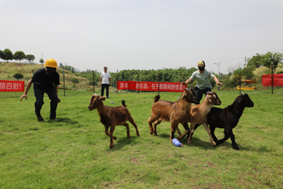 在景區(qū)農(nóng)耕體驗(yàn)區(qū),由立柱和柵欄圍成的占地約30余平方米場地內(nèi),一場生動(dòng)有趣的蒙眼抓羊、抓鴨活動(dòng)正熱火朝天地進(jìn)行,只見游客們以五人為一組,每人頭戴眼罩,在盲眼的狀態(tài)下,憑借敏銳的直覺與靈活的應(yīng)變能力,與活潑的羊群、鴨群展開一場歡樂的追逐。在圍觀游客的提示下,大家不斷調(diào)整方向和步伐,抓取屬于自己的“戰(zhàn)利品”,現(xiàn)場洋溢著濃郁的歡快氣息?;顒?dòng)以二分鐘為時(shí)限,游客抓取的羊、鴨以及日常生活用品等均歸本人所有。