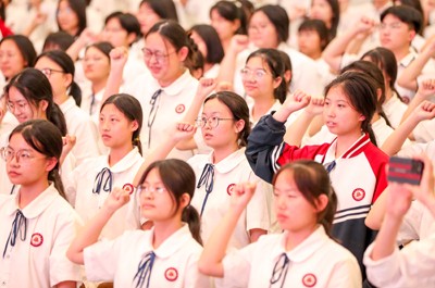 2025年5月13日,四川省華鎣中學(xué)的學(xué)生在“法佑青春,揚(yáng)帆未來”主題宣傳活動(dòng)中參加守法宣言。