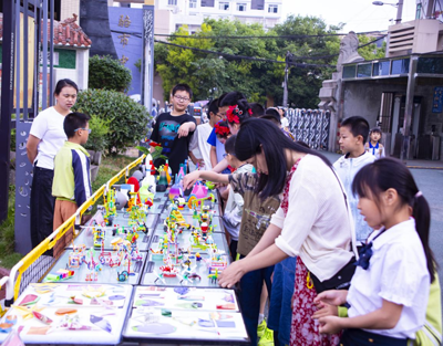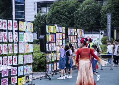 操場(chǎng)兩側(cè)同步展出學(xué)生創(chuàng)作的剪紙、烙畫(huà)、藍(lán)曬、錫紙版畫(huà)等作品,操場(chǎng)兩側(cè)的藝術(shù)展區(qū)猶如一條流動(dòng)的文化長(zhǎng)河,學(xué)生創(chuàng)作的藝術(shù)作品在陽(yáng)光下熠熠生輝。吸引眾多觀眾駐足品評(píng),有的俯身細(xì)看紋樣細(xì)節(jié),有的舉起手機(jī)記錄精彩,更有家長(zhǎng)指著自家孩子的作品驕傲地向旁人介紹,整個(gè)展區(qū)洋溢著藝術(shù)教育的豐碩成果與歡樂(lè)氛圍。