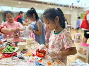 活動開始,假期學校的志愿者老師們首先讓孩子們自由組合小組,確立小組長。接著小組長給組員們分工。緊接著志愿者老師指導孩子們怎樣洗菜,手把手地教孩子們切菜。一切準備工作就緒。老師就指導孩子們炒菜和煮面。整個體驗過程井然有序地進行。一份份親手做出的菜肴擺上桌。孩子們吃著自己親手做的有鹽無味的炒菜總覺得比任何美食還好吃,因為它是自的勞動成果。這時小朋友心中只有滿滿的成就感。最后每個一小組一起收拾打掃衛(wèi)生,洗餐具、掃地、收拾桌面,大家分工進行。最后決出本次廚趣體驗活動小組排名。