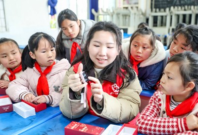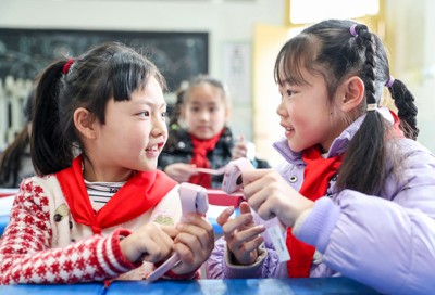 2025年3月19日,四川省華鎣市永興鎮(zhèn)安丙小學的留守兒童對剛領到的智能安全手環(huán)愛不釋手。