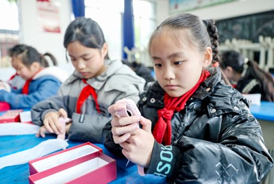 2025年3月19日,四川省華鎣市永興鎮(zhèn)安丙小學的留守兒童在愛心人士指導下,調試剛領到的智能安全手環(huán)。