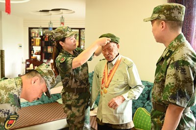 “老人家,您坐下,我們幫您佩戴抗日紀念章!”9月3日,榮縣退役軍人志愿服務(wù)隊隊員們8點30分就來到榮縣新城區(qū)抗戰(zhàn)老兵梁定江家,為老人佩戴好抗戰(zhàn)勝利80周年紀念章并戴好軍帽,坐在客廳等待閱兵式正式開幕!