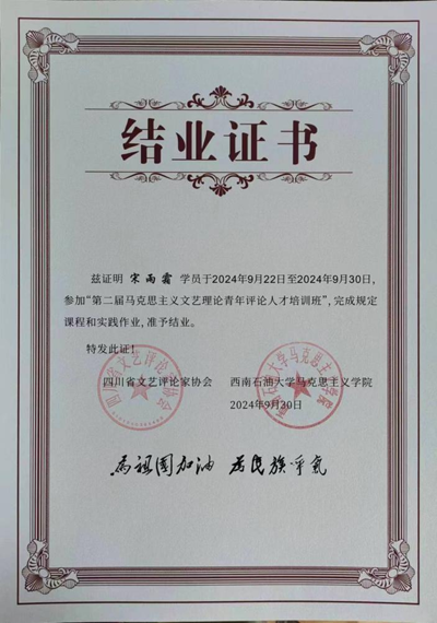 2024年9月22日至30日,由四川省文藝評(píng)論家協(xié)會(huì)、西南石油大學(xué)主辦,四川省馬克思主義文藝評(píng)論基地承辦的第二屆馬克思主義文藝?yán)碚撉嗄暝u(píng)論人才培訓(xùn)班在西南石油大學(xué)舉行培訓(xùn)活動(dòng)。成都文理學(xué)院青年教師、四川省文藝評(píng)論家協(xié)會(huì)會(huì)員宋雨霜經(jīng)過(guò)選拔,與另外29名學(xué)員一起參加了培訓(xùn)活動(dòng),通過(guò)教學(xué)考核獲得結(jié)業(yè)證書(shū)。