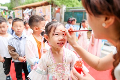 2025年5月28日,四川省華鎣市五星幼兒園的小朋友在接受寓意能避災驅(qū)邪的點抹雄黃酒,感受傳統(tǒng)文化的魅力,在開心中迎接端午佳節(jié)和六一兒童節(jié)。