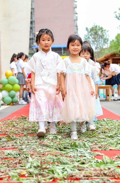 2025年5月28日,四川省華鎣市五星幼兒園的小朋友在鋪有艾草、菖蒲的路上行走,感受傳統(tǒng)文化的魅力,在開心中迎接端午佳節(jié)和六一兒童節(jié)。