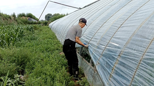 一個(gè)個(gè)白色大棚靜靜地坐落在壩子里,一個(gè)工人在一個(gè)大棚側(cè)面挨著整理薄膜開風(fēng)口,隨著他越走越遠(yuǎn),逐漸成為一個(gè)小點(diǎn),一直延伸到遠(yuǎn)方,與綠樹相接。充滿特色的黃頂白墻的小房子矗立在大棚中間。誰能想到一顆顆富有營養(yǎng)價(jià)值,漂亮的彩椒在里面悄悄孕育生長。(沈荷)