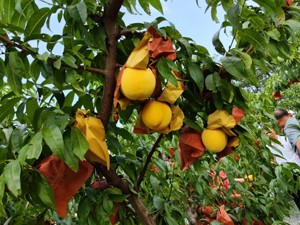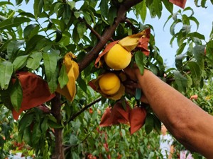 裝好黃桃,肖師弟摘了幾個(gè)蟠桃給我們吃。蟠桃扁扁的,還沒(méi)有到成熟期,酸味濃,但果肉脆,又是另一番滋味。