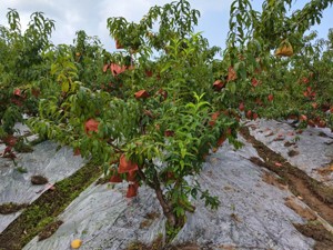 肖師弟是尖山村的村委委員,很勤勞的一個(gè)人。這個(gè)季節(jié)是黃桃上市的季節(jié)。坐著他的三輪車上山去采黃桃,簡(jiǎn)直是驚心動(dòng)魄。車在陡峭的山路上爬行,啪啪的發(fā)出響聲,人坐在車斗里,必須下蹲,死死的拉緊車廂邊的鐵杠,才有安全感。上的山去,一大片的黃桃園就在眼前,果實(shí)上套著袋,袋色的紅紅的,很遠(yuǎn)都能看見(jiàn)。地上鋪了一層薄膜,是為了讓雨水不至于太多入土,撐破果實(shí),降低黃桃的品質(zhì)。見(jiàn)到這么大一片桃園,我興趣暴增,照相,給桃園給黃桃個(gè)體照相。長(zhǎng)期勞作的肖師弟,五十歲左右,有黝黑的皮膚,健壯的體魄。他反應(yīng)敏捷,為我們邊介紹黃桃栽培經(jīng)驗(yàn),邊采摘桃子。他見(jiàn)我在照相,接連撕開(kāi)幾個(gè)套袋的黃桃,站在旁邊。讓位給我照相。掛在樹(shù)上黃燦燦的黃桃碩果累累,掛滿枝間。劉老師拿了一個(gè)桃子現(xiàn)場(chǎng)削皮,感受不一樣的味道。她削了一個(gè),切了一牙給我。我沒(méi)有吃的興趣,在肖家吃的那一個(gè)黃桃,幾乎讓我飽腹,吃一個(gè)足矣。在劉老師的勸說(shuō)下,我吃了薄薄一牙的黃桃肉,感覺(jué)桃的香味更濃,糖度更高。在征得肖師弟的同意下,我也摘了幾個(gè)黃桃,過(guò)了自己采摘的癮。大個(gè)大個(gè)的黃桃,讓人愛(ài)不釋手。我不敢說(shuō),饞涎欲滴了。畢竟那么大的桃子,剛才已經(jīng)把胃占得沒(méi)有空隙。采摘了三塑料桶,也差不多了。看看天也要下雨了,我們下山時(shí)再不敢坐三輪車。想想陡峭的山路,覺(jué)得步行更好。