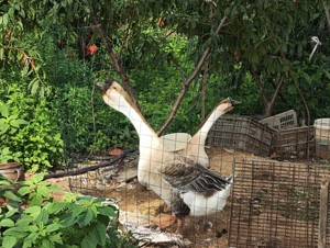 我發(fā)現(xiàn),車駛?cè)臊埲降纳仙焦泛?,出現(xiàn)了熟悉的街道,熟悉的大地魂,熟悉的金海棠,還有熟悉的房屋,到了鹽井。一了解,原來(lái)是到鹽井尖山村我?guī)煹苄ず闃?shù)家去,他是劉英偉老師的學(xué)生,晚我兩屆。鹽井也是我高中同學(xué)江曉偉、江義、萬(wàn)如銀、王正東、段秀玲的家鄉(xiāng)。陳師弟應(yīng)該是來(lái)過(guò)的,出了鹽井市場(chǎng)場(chǎng)口,他稍遲疑一下,就右轉(zhuǎn)上了一條鄉(xiāng)間水泥路。路往前開(kāi),越開(kāi)越窄,最后上個(gè)山坡就到了肖洪樹(shù)家門口。見(jiàn)到有人來(lái),門前籬落里的大鵝叫過(guò)不停,是少見(jiàn)的黑嘴鵝。向他家里走去時(shí),三只狗有兩只拴著的狗在狂吠,另一只則乖順一聲不吭,圍著我們轉(zhuǎn)圈圈。