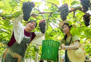 2023年7月12日,四川省廣安市社會保險局的黨員干部冒著酷熱,在華鎣市陽和鎮(zhèn)蔡家灣村幫農(nóng)家搶收熟透了的葡萄,體驗勞動的艱辛。