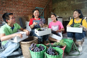 2023年7月12日,四川省廣安市社會保險局的黨員干部冒著酷熱,在華鎣市陽和鎮(zhèn)蔡家灣村幫農(nóng)家包裝銷往市場的葡萄,體驗勞動的艱辛。