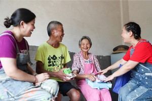 2023年7月12日,四川省廣安市社會保險局的黨員干部冒著酷熱,在華鎣市陽和鎮(zhèn)蔡家灣村看望慰問老黨員江顯發(fā)(左二)。