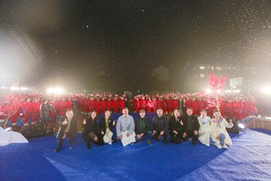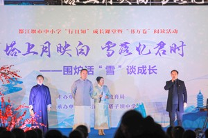活動在悠揚的古箏中拉開帷幕。忽然,大雪紛飛,時間仿佛被拉回到了百年前周因培重建奎光塔時。在正逢大雪節(jié)氣時,周因培向大家講述了奎光塔的前世今生和重學(xué)興文的重要性,通過后生知道了自己籌資建塔、振興文風(fēng)的成果,以及所創(chuàng)建的“蜚英”文舍演變?yōu)椤八訅沃袑W(xué)”的過程,與師生一起共睹百年后灌縣學(xué)子溯古追今的一場精彩盛宴。