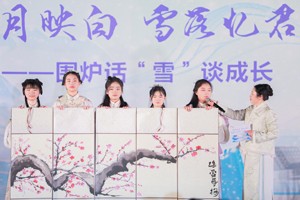 這場"盛宴"分別演繹了四個篇章。篇章一,師生們“推窗見雪,飛花凈白”,走進了一場雪的記憶。從《詠雪》《踏莎行·雪似梅花》,到《梅花》《壽陽曲·江天暮雪》等,以一首首詩詞,吟誦盛雪美景。后又以飛花令,對起了含“雪”字的詩句,并齊聲吟誦《沁園春·雪》。