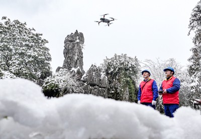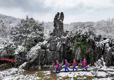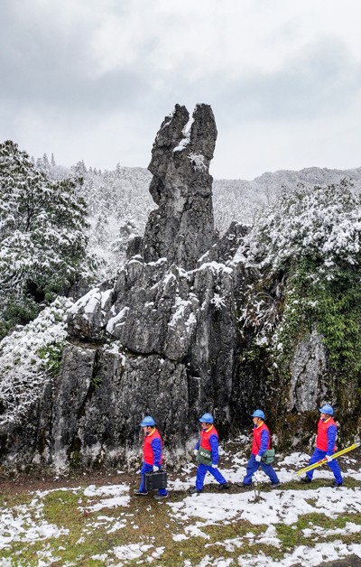 2025年1月10日,國家電網(wǎng)四川省華鎣市供電公司的共產(chǎn)黨員服務(wù)隊(duì),踏著積雪奔忙在華鎣山區(qū),用無人機(jī)巡檢供電線路安全運(yùn)行情況。(邱海鷹 張 鳳/文圖)