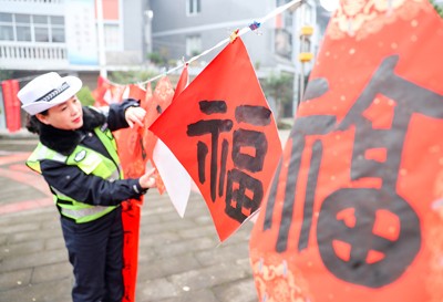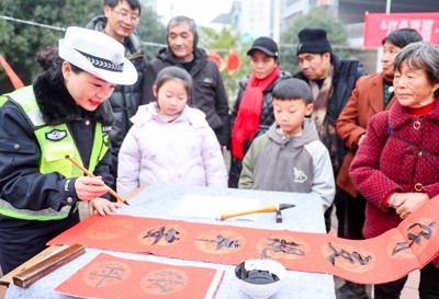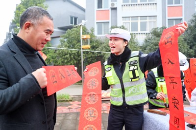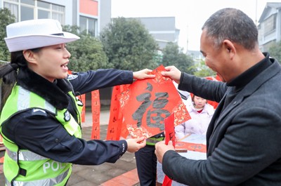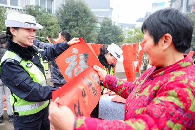 新春佳節(jié)臨近,四川省華鎣市公安局交通警察大隊(duì)組織書法愛好者巡回到鄉(xiāng)村,為返鄉(xiāng)團(tuán)年的務(wù)工人員和鄉(xiāng)親義務(wù)書寫贈(zèng)送“交安春聯(lián)”和平安“?!薄ⅰ按骸弊值乳T貼,提醒鄉(xiāng)親在春節(jié)期間走親訪友不酒后開車、平安出行,祝福鄉(xiāng)親過上一個(gè)快樂平安的佳節(jié)。