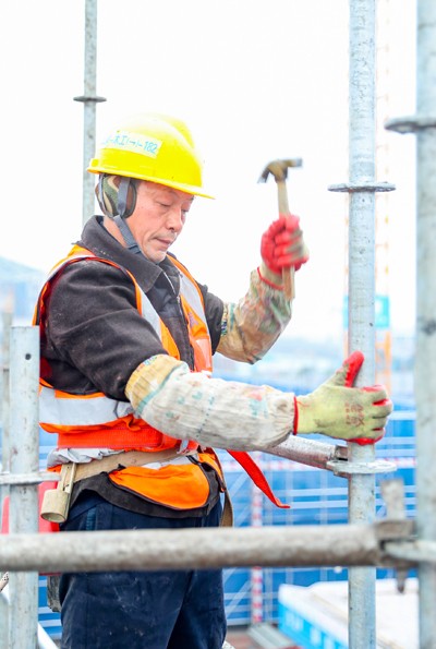 2025年2月2日(大年初五),在四川省廣安市廣安區(qū)官盛新區(qū)廣安理工學院建設工地,中建三局的建設者正冒著雨霧天氣在腳手架上緊張作業(yè)。