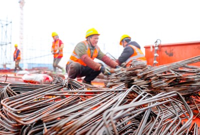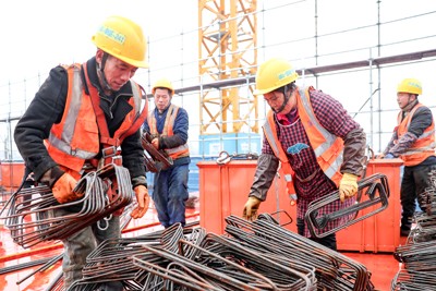 2025年2月2日(大年初五),在四川省廣安市廣安區(qū)官盛新區(qū)廣安理工學院建設工地,中建三局的建設者正冒著雨霧天氣轉(zhuǎn)運鋼筋。