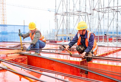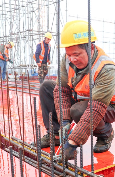 2025年2月2日(大年初五),在四川省廣安市廣安區(qū)官盛新區(qū)廣安理工學院建設工地,中建三局的建設者正冒著雨霧天氣綁扎鋼筋。(邱海鷹)