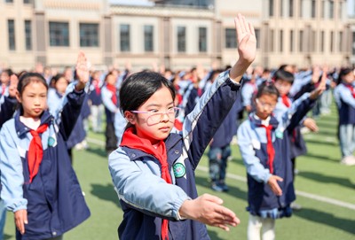 2025年3月27日,四川省華鎣市紅巖小學的學生利用大課間練習“交通手勢操”,迎接第30個“全國中小學生安全教育日”。