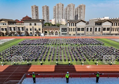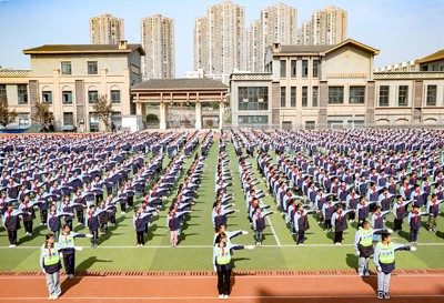 2025年3月27日,四川省華鎣市紅巖小學的學生利用大課間練習交通警察手勢信號廣播體操(簡稱“交通手勢操”),迎接第30個“全國中小學生安全教育日”。