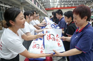 2023年7月21日,四川省華鎣市的青年普法志愿者在華鎣山經(jīng)開區(qū)四川瀚海精密制造有限公司,給正在工間休息的員工發(fā)放裝有法治圖書、法律援助聯(lián)系卡、防暑解暑物品的“法治大禮包”。