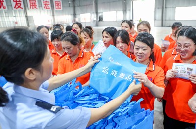 2025年6月23日,四川省華鎣市華鎣山經(jīng)開區(qū)大千電子廠的務(wù)工人員,在領(lǐng)取禁毒志愿者發(fā)放的裝有禁毒宣傳資料等物品的“法治大禮包”。