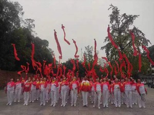 我們將象青松永遠(yuǎn)屹立在高高的山峰上。此時此刻,隊員們高高拋起紅綢,跳躍著!歡呼著!快樂著!為了把熱烈的氣氛推向高潮,大家又舉著小紅旗高歌《沒有共產(chǎn)黨就沒有新中國》巜革命人永遠(yuǎn)是年青》《團(tuán)結(jié)就是力量》。宏亮的歌聲響徹公園,給重陽節(jié)帶來了最熱烈而歡樂的氣氛。給棠湖公園廣埸增添了獨特的亮麗風(fēng)景。