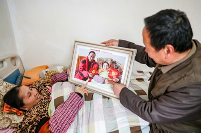 2025年2月28日,四川省廣安華鎣市古橋街道古橋社區(qū)因幾十年照顧癱瘓在床的妻子獲得“中國好人”殊榮的趙玉春,與妻子欣賞志愿者專程送來的“全家?!?。