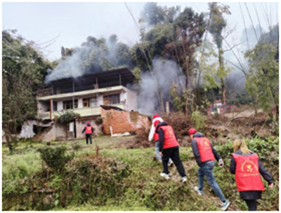 當(dāng)天上午,隨著王殿明家慰問幫扶活動的結(jié)束,志愿者們愉快地踏上回歸的路途,而就在這時,他們突然發(fā)現(xiàn)鄰村方向升起一股濃煙,“不好,有農(nóng)戶房屋著火了。”情況十分危機(jī),撲火刻不容緩。于是,大家迅速集結(jié),徒步趕往現(xiàn)場。只見火勢越來越大,煙霧直冒空中,而且逐漸往附近的山坡蔓延,如不及時撲滅,后果將難以想象。