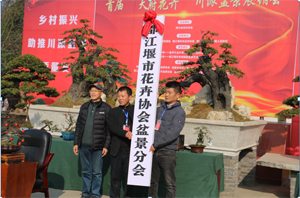 王學忠、唐建接過劉剛“都江堰市花卉協(xié)會盆景分會”的授牌。分會會長王學忠作了發(fā)言。他介紹了都江堰市青城微型盆景藝術研究中心在微盆景原材料選擇培育、制作技藝、創(chuàng)造創(chuàng)新、宣傳營銷和帶動當?shù)剞r民增收致富等方面的工作。他表示,要在黨委和政府領導下,不辜負花協(xié)和會員們的期望,及時謀劃好盆景分會工作,團結帶領會員們?yōu)閭鞒泻桶l(fā)揚盆景技藝、盆景文化,充分發(fā)揮安龍川派盆景傳承基地作用,加大小微盆景開發(fā)力度,積極推動各類盆景人才隊伍建設,探索盆景發(fā)展新方式、新路徑,開拓川派盆景新思維。