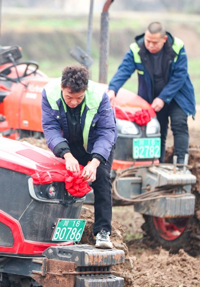 2025年2月3日,四川省華鎣市華龍街道東方村的農(nóng)民在田間給“犁春?!钡摹拌F?!迸宕鞔蠹t花,準(zhǔn)備動土翻耕農(nóng)田迎接“立春”。(邱海鷹 劉南賢/攝影報道)