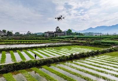 2025年4月9日,四川省廣安市盛世農(nóng)業(yè)有限責(zé)任公司華鎣市華龍街道沙壩村糧油基地的工作人員,利用無人機(jī)給即將移栽的秧苗噴灑殺蟲劑。