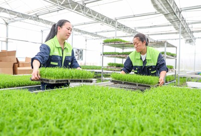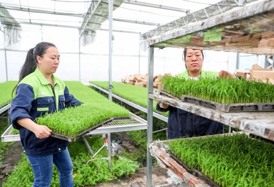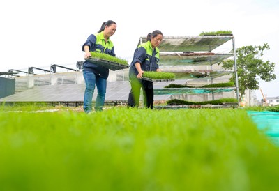 2025年4月9日,四川省廣安市盛世農(nóng)業(yè)有限責(zé)任公司鄰水縣袁市鎮(zhèn)糧油基地的工作人員,在育秧中心給即將移栽的秧苗煉苗。(邱海鷹/文圖)