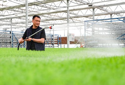 2025年4月9日,四川省廣安市盛世農(nóng)業(yè)有限責(zé)任公司鄰水縣袁市鎮(zhèn)糧油基地的工作人員,在育秧中心給即將移栽的秧苗澆水。
